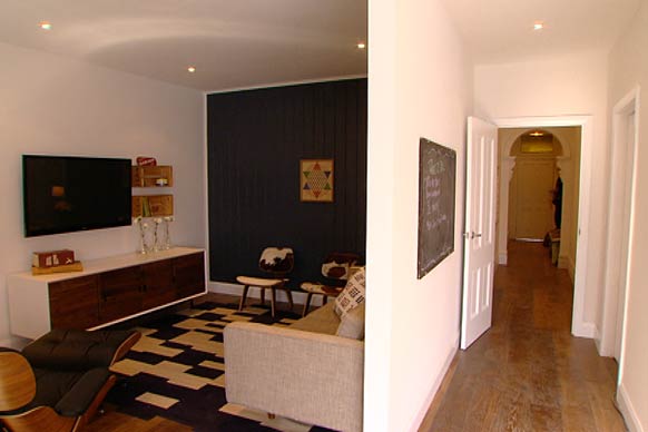 在灰色的牆面空間中,以活潑的橘色和黃色作點綴,讓整體空間不至於太過呆版;牆上的掛圖也強調設計者的獨特幽默感.....